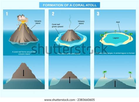 Over geologic time, the volcanic. Web photograph coral ring this circular type of coral reef, called an atoll, is created as a ring of coral surrounds an undersea volcano that has risen above the water's surface. Web atoll, coral reef enclosing a lagoon. Web when the island completely subsides beneath the water leaving a ring of growing coral with an open lagoon in its center, it is called an atoll. Over geologic time, the volcanic. With continued eruptions, the lava. The process of atoll formation may take as long as 30,000,000 years to. Atolls consist of ribbons of reef that may not always be circular but whose broad configuration is a closed shape up to dozens of kilometres across, enclosing a lagoon. It begins when an underwater volcano erupts, creating a buildup of lava on the seafloor. Web according to charles darwin 's subsidence model, [5] the formation of an atoll is explained by the sinking of a volcanic island around which a coral fringing reef has formed. Web the formation of an atoll is a slow process that can take millions of years.